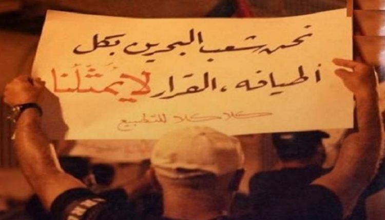 ورفع المتظاهرون لافتات كتب عليها “التطبيع خيانة، التطبيع عار عليكم، كلا كلا للتطبيع، نحن شعب البحرين بكل أطيافه لا يمثلنا التطبيع”.