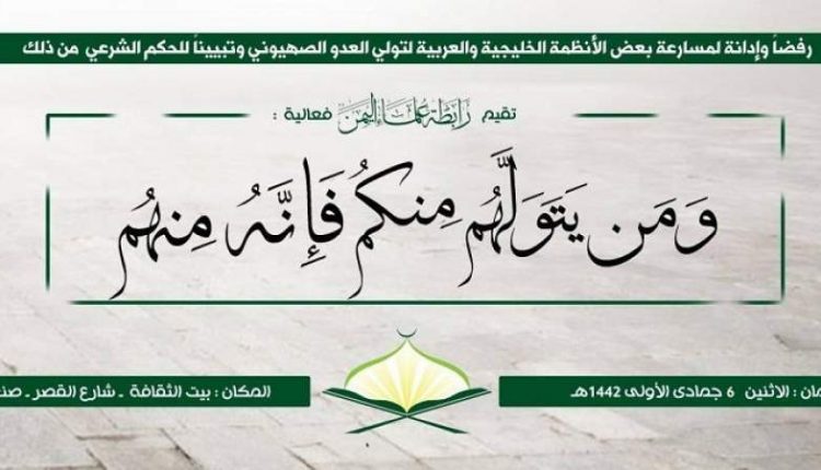 رابطة علماء اليمن في بيان تم تلاوته خلال فعالية أقيمت بالعاصمة صنعاء تحت شعار “ومن يتولهم منكم فإنه منهم” اعتبرت أن مسارعة بعض الأنظمة للارتماء في الحضن الصهيوني والأمريكي لا يغير من حقيقة أن “إسرائيل” عدو الأمة كلها.