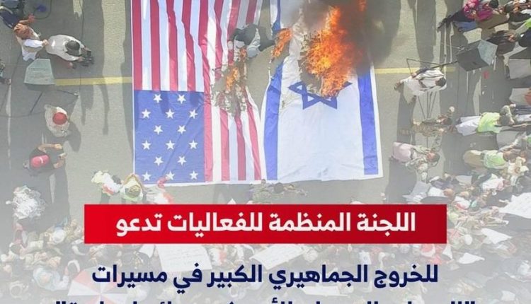 ففي العاصمة صنعاء حددت اللجنة المنظمة ساحة باب اليمن مكانا لمسيرة “العدوان والحصار الأمريكي جرائم إرهابية” عصر غد الاثنين .