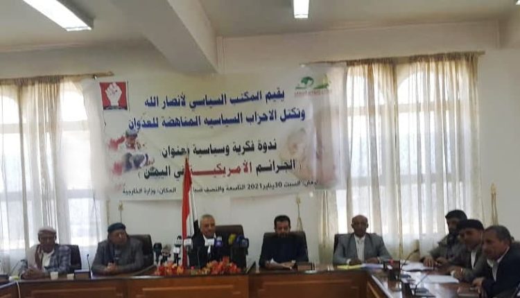 عٌقدت بصنعاء اليوم السبت ، ندوة سياسية بعنوان الجرائم الأمريكية في اليمن، نظمها المكتب السياسي لأنصار الله وتكتل الأحزاب السياسية المناهضة للعدوان.