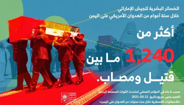 وفيما يتعلق بخسائر الجيش الإماراتي فأكد سريع أنها بلغت حتى تاريخ 23مارس 2020م ة أكثر من 1240 ما بين قتيل ومصاب.