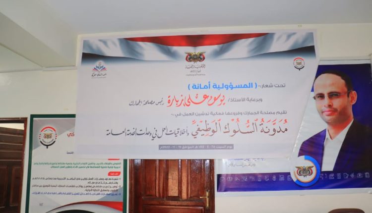 دشن رئيس مصلحة الجمارك الاستاذ يوسف علي زبارة فعالية العمل في مدونة السلوك الوظيفي وأخلاقيات العمل في وحدات الخدمة العامة، يوم السبت ٢٥ ربيع الثاني ١٤٤٤ه الموافق 19 نوفمبر الحالي، في ديوان عام مصلحة الجمارك وفروعها .
