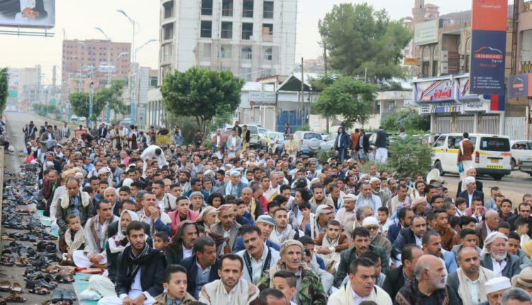 ادى موظفي شركة النفط اليمنية واللجان النقابية وجموع غفيره من المواطنين اليوم صلاة عيد الأضحى المبارك بشارع الستين امام مكتب الامم المتحدة .