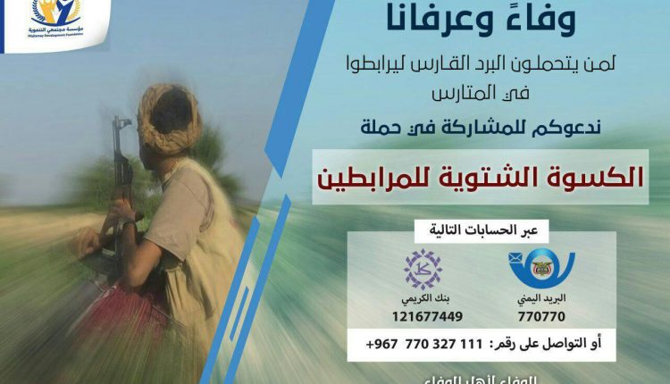 ودعت المؤسسة جميع أبناء الشعب اليمني، للمشاركة الفعالة في حملة “الكسوة الشتوية للمرابطين” من أبطال الجيش واللجان الشعبية.