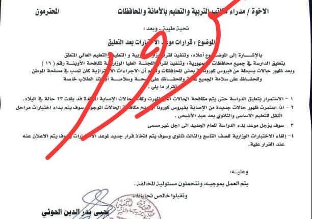 نفى مصدر مسئول بوزارة التربية والتعليم ماتروج له بعض الابواق الاعلامية التابعة للعدوان بخصوص قرارات جديدة حول مواعيد اختبارات النقل والشهادتين العامة..