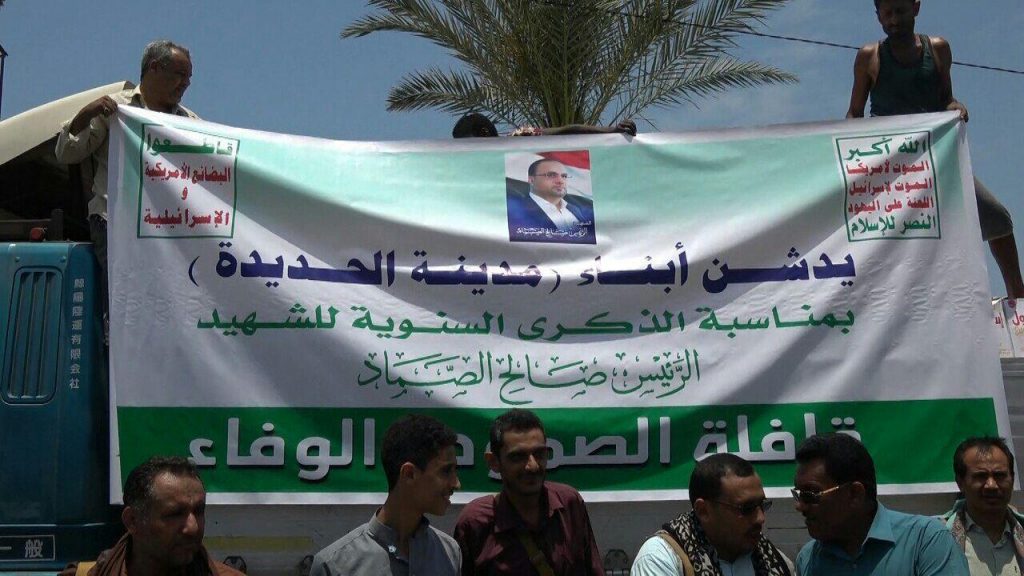 سير أبناء ومشائخ وأعيان مربع المدينة بمحافظة الحديدة وقفة وقافلة غذائية ومالية بمناسبة الذكرى السنوية للشهيد صالح الصماد وباسم قافلة الصمود والوفاء دعما وإسنادا للمرابطين في الجبهات من الجيش والجان الشعبية وتدشين للعام السادس من العدوان السعودي على اليمن