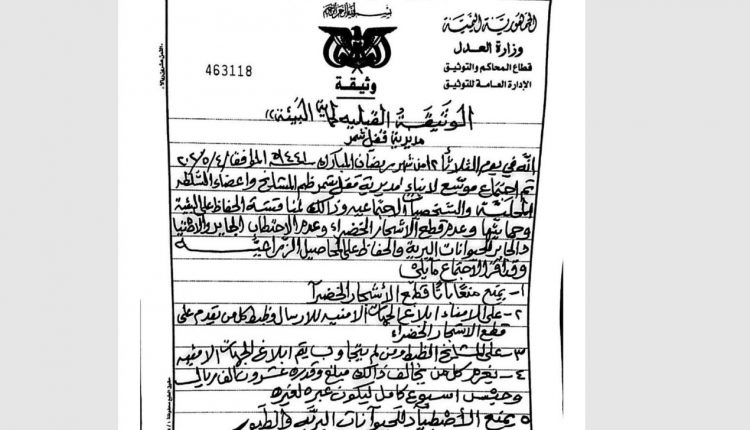 من جانبه أشار مسؤول مجلس التلاحم القبلي بالمديرية صادق الكريم إلى أن الوثيقة تترجم دور القبيلة اليمنية في الحفاظ على البيئة .