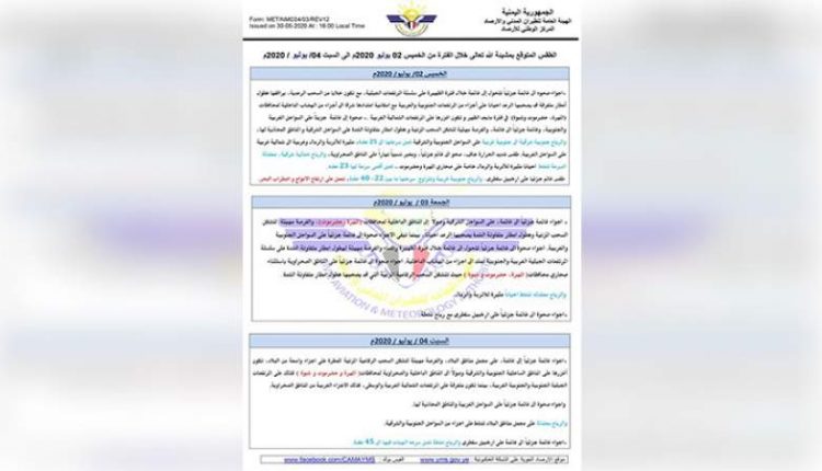 وذكر المركز في نشرته الجوية أنه قد تتشكل السحب الركامية المتفرقة الممطرة المصحوبة بالعواصف الرعدية أحياناً على أجزاء من سلسلة المرتفعات الجبلية الغربية، وامتدادها شرقا إلى المناطق والهضاب الداخلية لمحافظات المهرة، حضرموت، البيضاء، وشبوة.