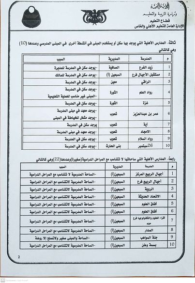 أصدر قطاع التعليم بوزارة التربية ممثلا بالإدارة العامة للتعليم الأهلي اليوم قائمة بالمدارس الأهلية التي بها مخالفات واختلالات جوهرية في أمانة العاصمة للعام الدراسي ٢٠٢٠ /٢٠١٩م، والتي سبق وأن مُنحت فرصة اخيرة لمعالجة الاختلالات..