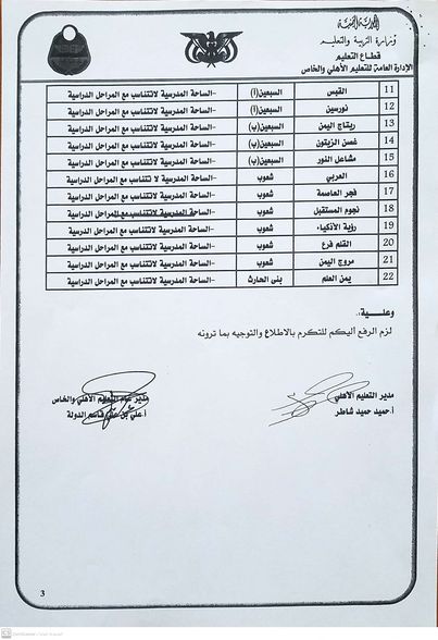 وأكدت الإدارة العامة للتعليم الأهلي أنه بحسب توجيه وكيل قطاع التعليم أ. عبدالله علي النعمي في حال عدم المعالجة سيتم إصدار قرار بإغلاق هذه المدارس والتوجيه إلى المعنيين بعدم تعميد أو قبول اي وثيقة تصدر عن هذه المدارس.