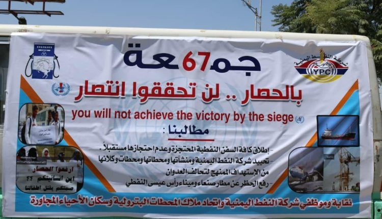 وفي الوقفة ندد بيان صادر عن ملاك المحطات البترولية الأهلية، باستمرار العدوان في احتجاز سفن المشتقات النفطية.. مطالبا بإطلاق كافة السفن النفطية المحتجزة وضمان عدم احتجازها مستقبلا.