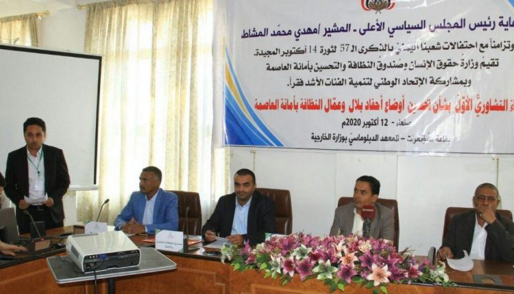 نظمت وزارة حقوق الإنسان وصندوق النظافة والتحسين بأمانة العاصمة اليوم، اللقاء التشاوري الأول لتحسين أوضاع أحفاد بلال وعمال النظافة بالأمانة بمشاركة الاتحاد الوطني لتنمية الفئات الأشد فقرا.
