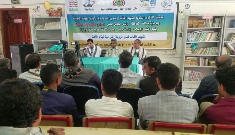 نظم مكتبا الإعلام والثقافة وإذاعة حجة اليوم الاثنين، فعالية ثقافية بعنوان ” الشهيد القائد قدم الرؤية القرآنية لبناء الأمة” تدشينا لفعاليات إحياء الذكرى السنوية للشهيد القائد.