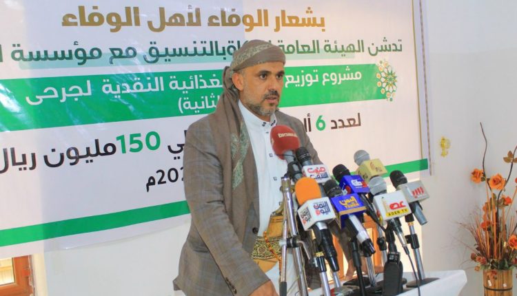 دشنت الهيئة العامة للزكاة اليوم بصنعاء ، بالتنسيق مع مؤسسة الجرحى ، مشروع توزيع السلال الغذائية النقدية لعدد 6 آلاف جريح “الفئة الثانية” بتكلفة إجمالية بلغت 150 مليون ريال تحت شعار ” الوفاء لأهل الوفاء”.