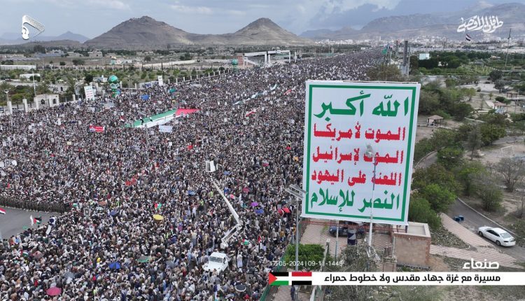 وأكدت الحشود، أنه وانطلاقا من المسؤولية الدينية والإنسانية والأخلاقية تجاه الشعب الفلسطيني المظلوم، خرج الشعب اليمني اليوم في مسيرة جماهيرية مليونية في مختلف المحافظات والمديريات والمدن اليمنية تحت عنوان “مع غزة جهاد مقدس ولا خطوط حمراء”.