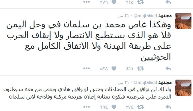 وقال “مجتهد” في سلسلة تغريدات جديدة له عبر حسابه على موقع «تويتر»: ‘محمد بن سلمان مستميت لإنهاء الحرب في اليمن والتراجع الكامل عن القرار الأممي بتسليم الحوثيين سلاحهم وقبولهم بشرعية هادي وخروجهم من المدن’.