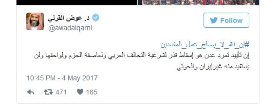 وفي معرض رده على التصريحات الاماراتية، اعتبر الداعية الوهابي التكفيري السعودي البارز عوض القرني أن ما جرى بعدن بالتمرد، وعلق على حسابه في تويتر بالقول: “إن تأييد تمرد عدن هو إسقاط قذرلما أسماه بشرعية التحالف العربي ولعاصفة الحزم ولواحقها ولن يستفيد منه بما ادعاه وأسماه إيران والحوثي”.