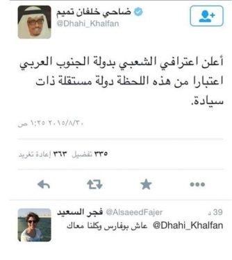 أما المدعو ضاحي خلفان نائب رئيس شرطة دبي السابق فقال عبر تغريدة على التويتر “أعلن اعترافي الشعبي بدولة الجنوب أعتبارا من هذه اللحظه دولة مستقله ذات سيادة