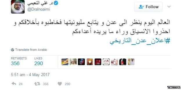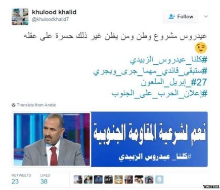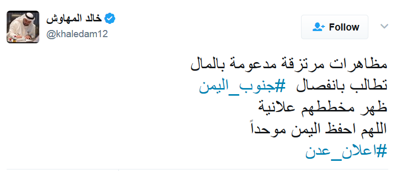 أما الكاتب السعودي خالد المهاوش، فأدان مطالب أهالي جنوب اليمن بالانفصال عن باقي الدولة اليمنية، وقال في تغريدة عبر حسابه على موقع التدوين المصغر “تويتر”: “مظاهرات مرتزقة مدعومة بالمال، تطالب بانفصال جنوب اليمن، ظهر مخططهم علانية اللهم احفظ اليمن موحداً، إعلان عدن”