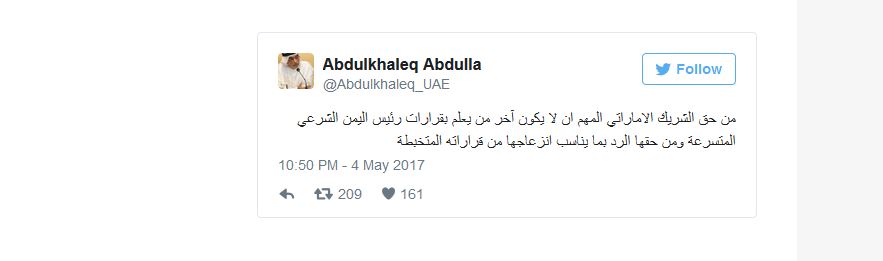 في حين هاجم أستاذ العلوم السياسية الإماراتي عبد الخالق عبد الله الفار هادي بعنف، وعلق على قرارات الأخيرة بالقول: “من حق الشريك الإماراتي المهم أن لا يكون آخر من يعلم بقرارات هادي المتسرعة ومن حقها الرد بما يناسب انزعاجها من قراراته المتخبطة”.