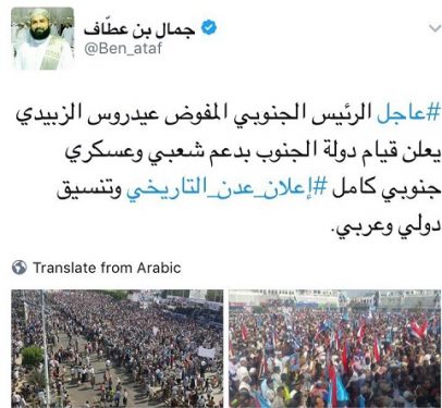 في حين قال الأكاديمي السعودي المعروف عبد العزيز “#إعلان_عدن_التاريخي يشبه تماما ما تصفه وتدعيه وتروج له وسائل اعلام العدوان على اليمن بانه انقلاب ، والدولة التي تؤيد البيان ستكون منقلبة على عاصفة الحزم، وسوف تتعقد المسألة اليمنية”.