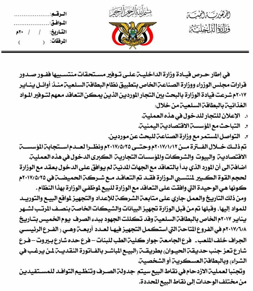 و أوضح البيان أن الوزارة بدأت بصرف البطاقة السلعية لمنتسبيها من يوم الخميس 9-6-2017 في الفروع المتاحة لشركة الحميضة كونها هي الوحيدة التي قبلت التعاون مع الوزارة و التعامل معها بنظام البطاقة السلعية .