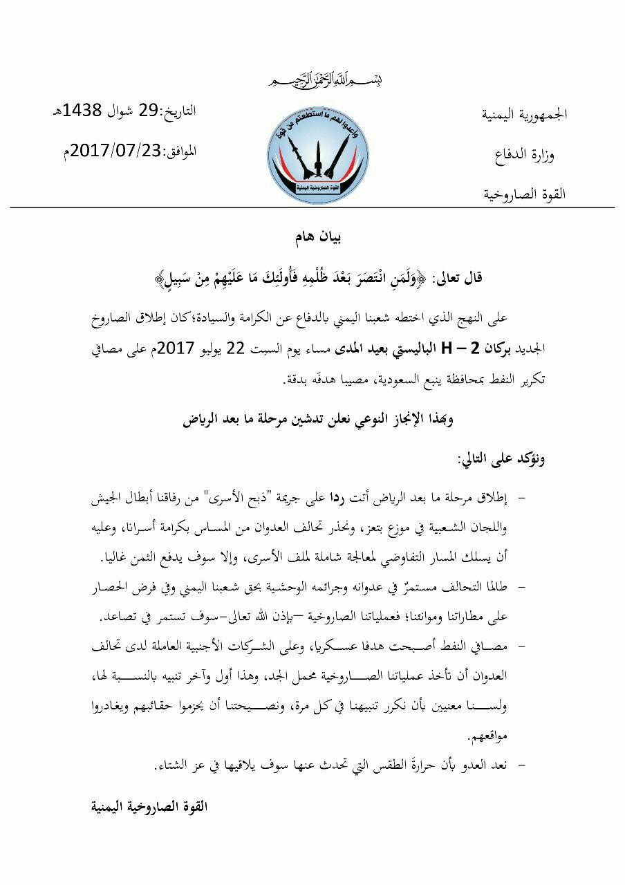 وذكر بيان صدر عن القوة الصاروخية، عقب ساعات من إطلاق صاروخ بركان 2-H الباليستي على مصافي تكرير النفط السعودي في محافظة ينبع والذي أصاب هدفه بدقة ذكر، أن العمليات الصاروخية سوف تستمر في تصاعد ردا على استمرار العدوان والحصار، محذرا “تحالف العدوان من المساس بكرامة أسرانا وأن على العدو أن يسلك المسار التفاوضي لمعالجة ملف الأسرى مؤكدا أنه سيدفع الثمن غاليا إن لم يقم بذلك”.
