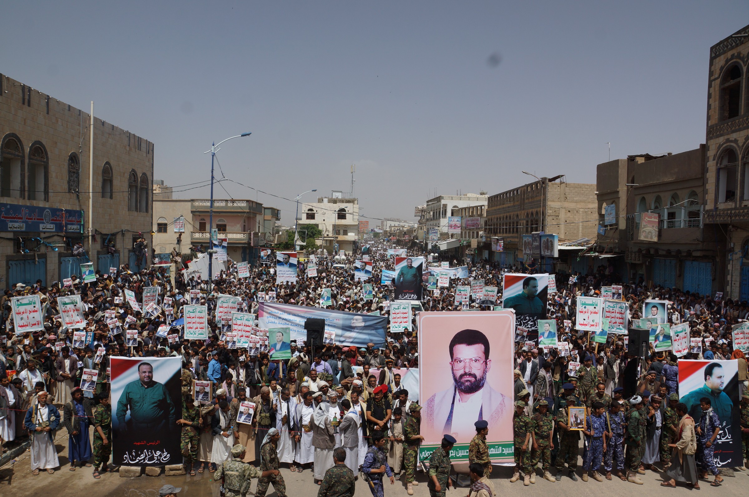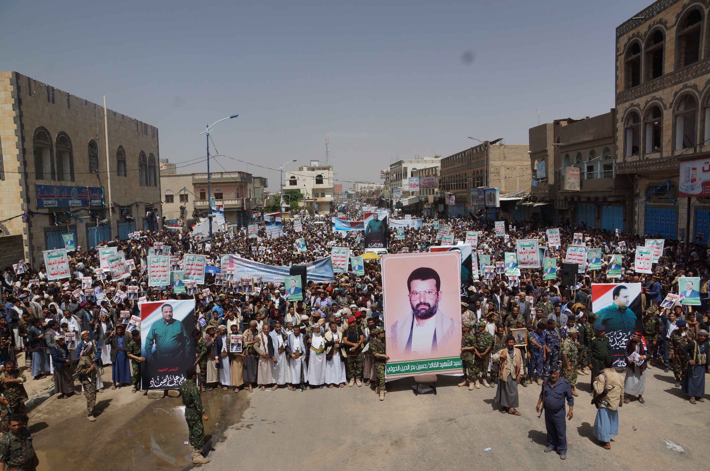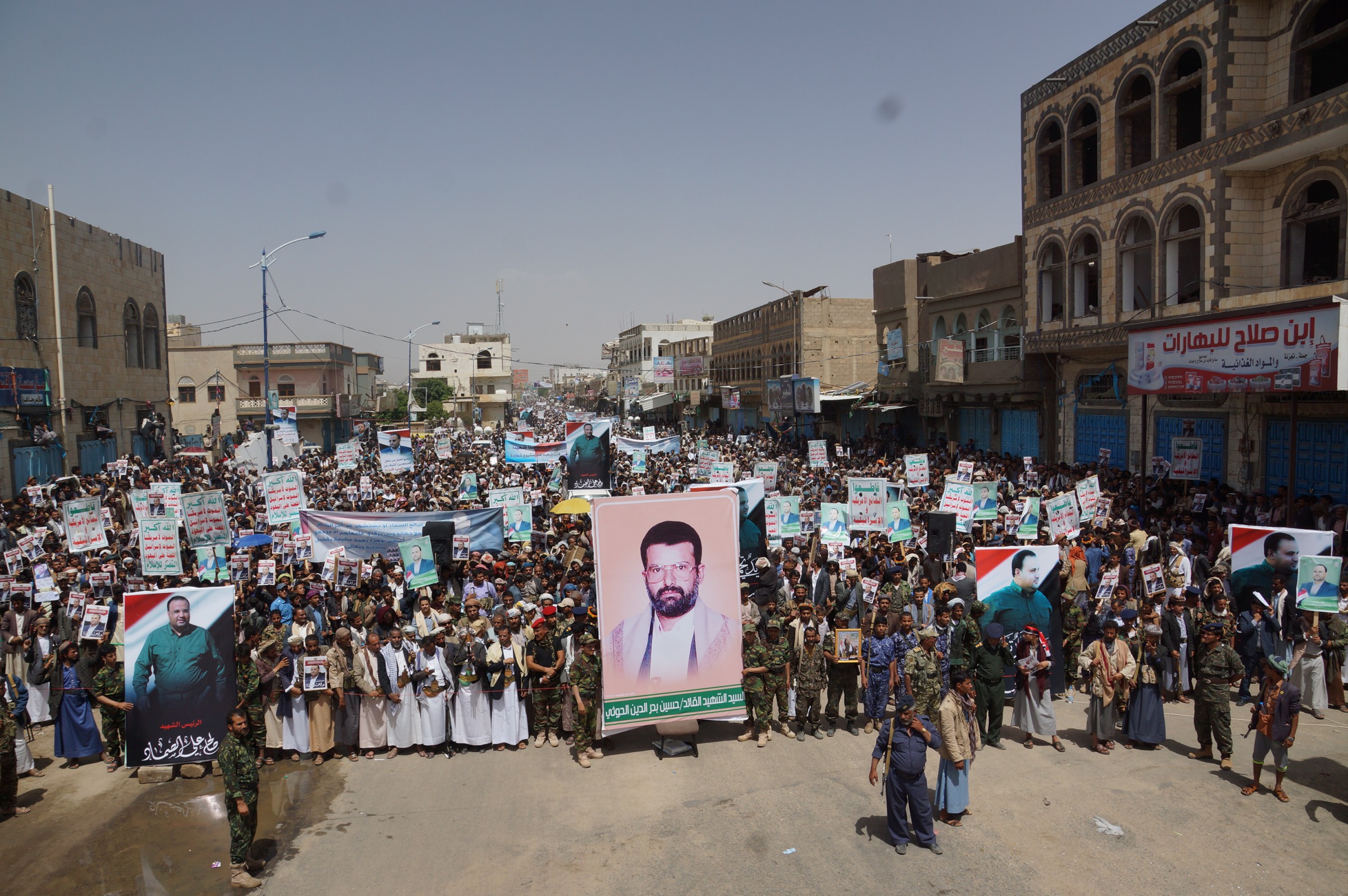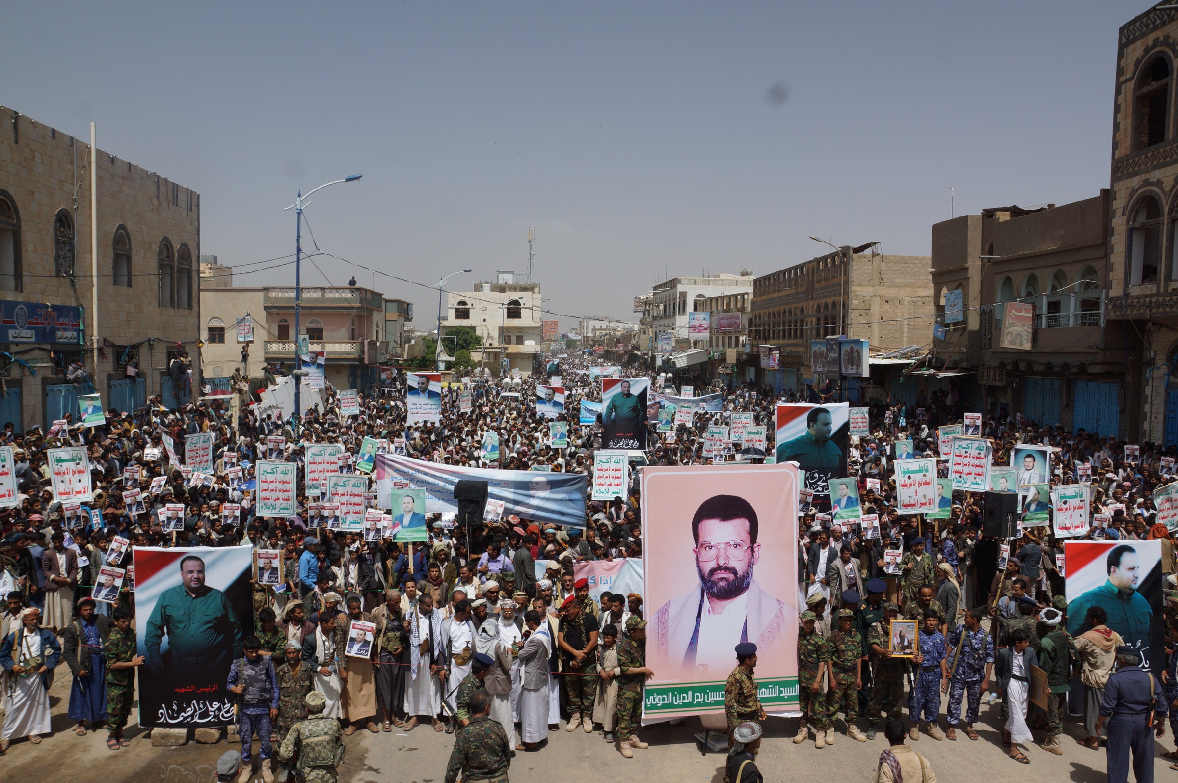 وإننا في هذه المسيرة الحاشدة مسيرة ” الوفاء لرئيس الشهداء” نرفع أسمى أيات العزاء والمواساة للسيد القائد عبد الملك بدر الدين الحوثي وللمجلس السياسي الأعلى ولأسرة الشهيد وللأمة الإسلامية جمعاء بهذا المصاب الجلل والخسارة الفادحة التي كانت المرحلة بحاجة إلى هذه القامة السامقة والرجل المؤمن والنزيه .
