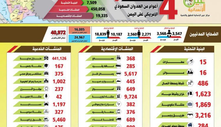 وكشفت آخر إحصائيات مركز عين الانسانية أن العدوان الأمريكي السعودي الإماراتي دمر 15 مطارا و16 ميناء وثلاثة ألاف و216 طريق وجسر، و284 محطة ومولد كهرباء، وألف و623 خزان وشبكة مياه، و486 شبكة ومحطة اتصالات وألف و869 منشأة حكومية بمختلف المحافظات.