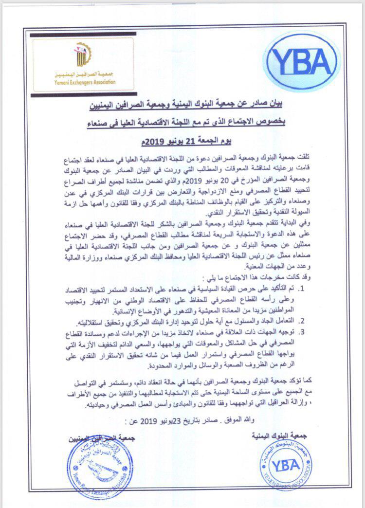 وأصدرت الجمعيتين اليوم الأحد بيان توضيحي هام بعد تلقيهما دعوة من اللجنة الاقتصادية العليا في صنعاء لعقد اجتماع لمناقشة المعوقات والمطالب التي وردت في البيان الصادر من جمعية البنوك وجمعية الصرافين اليمنيين بتأريخ 20-6-2019م.