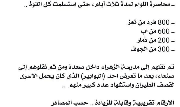 واوردت الصفحة معلومات أولية عن ما جرى في كتاف عقب محاصرة ابطال الجيش واللجان الشعبية للواء عسكري تابع للعدوان في المديرية شمال صعدة طيلة ثلاثة أيام.. معترفة بوقع عدد كبير من المرتزقة في الاسر منهم 800 مرتزق من محافظات تعز و 600 من إب و 200 من ذمار و 300 من محافظة الجوف.. واشارت الى انه بعد إستسلام افراد اللواء قام الطيران السعودي بقصفهم مما ادى الى مقتل عدد كبير منهم، ليتم بعدها نقلهم الى صنعاء بالتنسيق مع المنظمات الدولية ونقل المصابين الى المستشفيات.